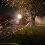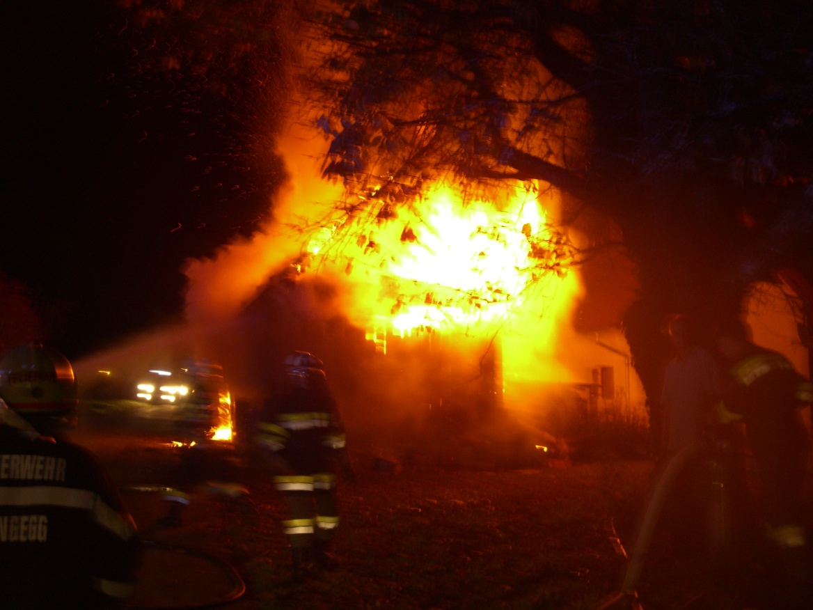 Beim Eintreffen der Feuerwehr um 05:00 Uhr war bereits ein Fenster eines Nebenhauses durch die Strahlungswärme zerbrochen.