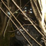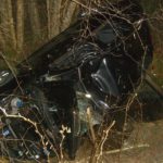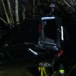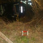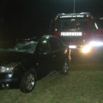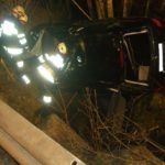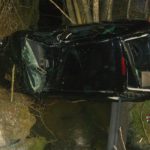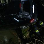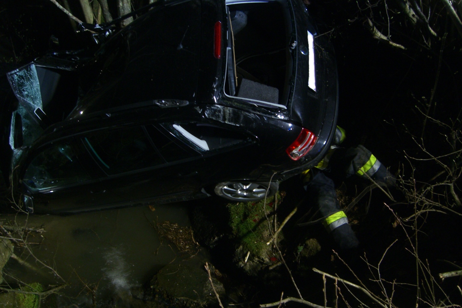 PKW am Dach in Bachbett Person im Fahrzeug eingeklemmt.