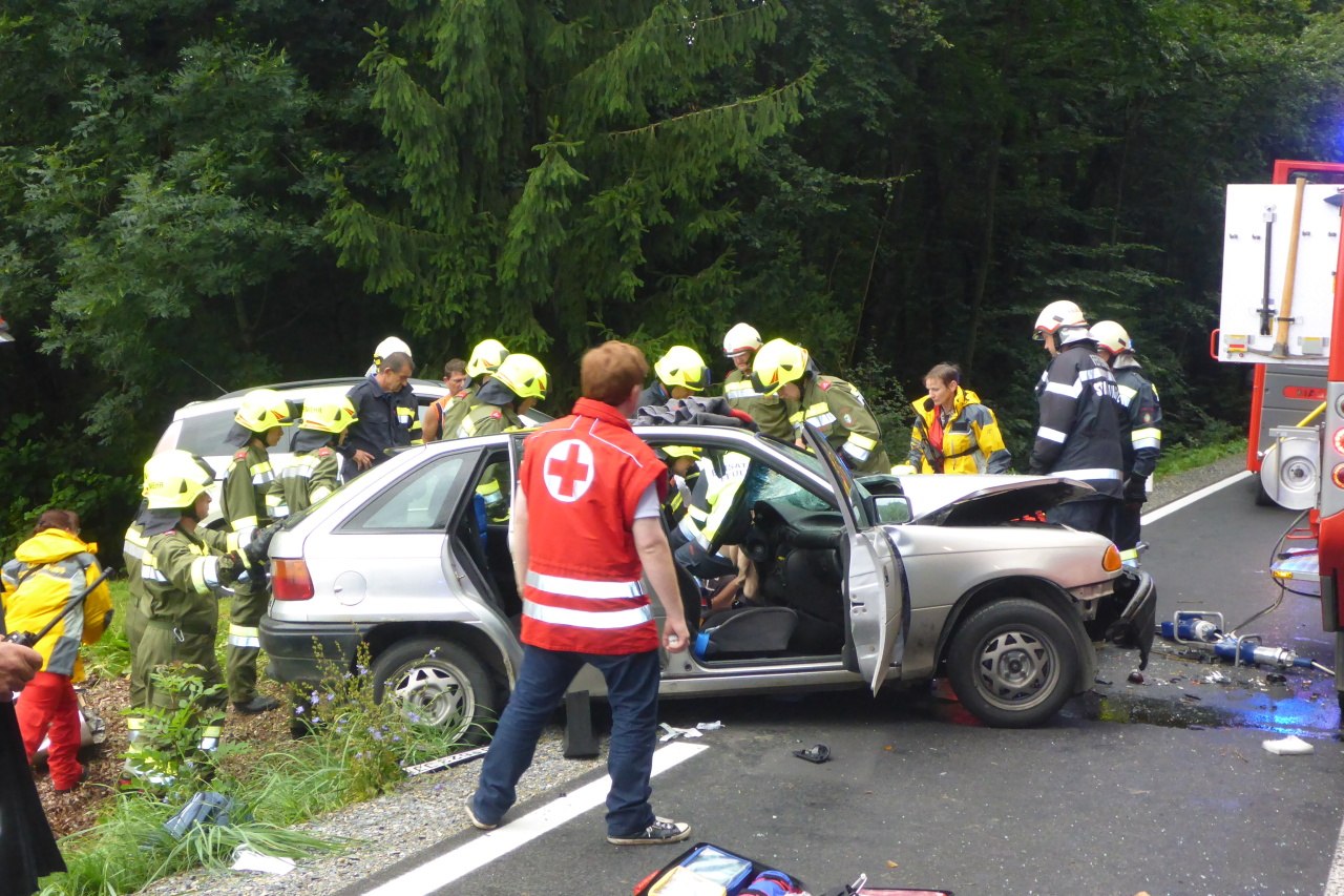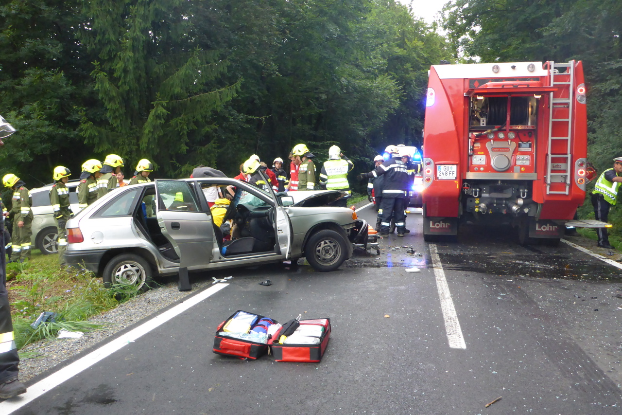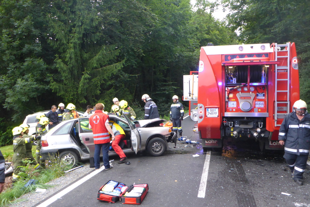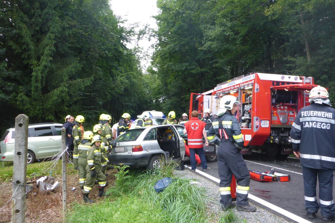 Verkehrsunfall auf der L305 12. August 2014 webmaster Allgemein Am 12.08.2014 14:35 Uhr wurde die FF-Langegg wegen eines Verkehrsunfalls mit einer eingeklemmten Person alarmiert. Eingesetzt waren: FF-Langegg FF-Krumegg FF-St.Marein Polizei Rotes Kreuz
